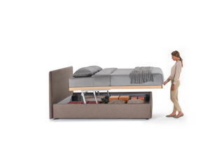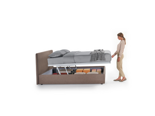 Zu allen Eigenschaften des Pratik-Containers kommen die des Wood hinzu, dem neuen Buchenrahmen, der in der Schreinerei von Dorelan für die Produktion eines 100% italienischen Produkts entworfen und hergestellt wurde. Der Pratik Wood Container ist ein Bettsystem mit einem doppelt hebbaren Container, der dank eines speziellen Mechanismus mit Doppelkolben das Anheben der Auflagefläche und der Matratze sowohl in einem Winkel von 45° als auch parallel zum Boden ermöglicht, wodurch das Bettenmachen erleichtert und weniger anstrengend wird.
