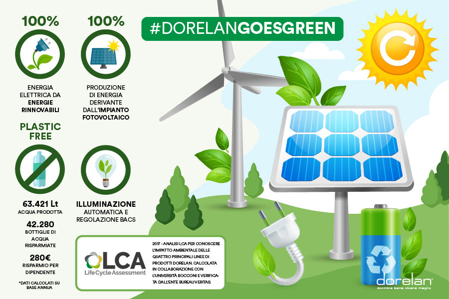 Dorelan è quotidianamente impegnata nell'attuazione di una politica sostenibile volta a ridurre gli impatti ambientali di tutte le sue attività e a migliorare le performance ambientali dei processi e dei prodotti, attraverso interventi e programmi di formazione dei dipendenti. I 62.000 metri quadrati di sede produttiva, quasi equamente divisi tra spazi interni ed esterni, sono alimentati da un impianto fotovoltaico di potenza nominale pari ad 1 MW che riesce ad auto-produrre circa la metà dell’intero fabbisogno energetico dell’azienda. Parte di questa energia viene immessa nella rete nazionale: nel 2015 Dorelan ha ceduto 703.170 kWhe, acquistando dalla rete 679.665 kWhe (di cui un 30% proveniente da fonti rinnovabili). Questo significa che lo stabilimento produce tutta l’energia di cui ha bisogno in un anno solare.